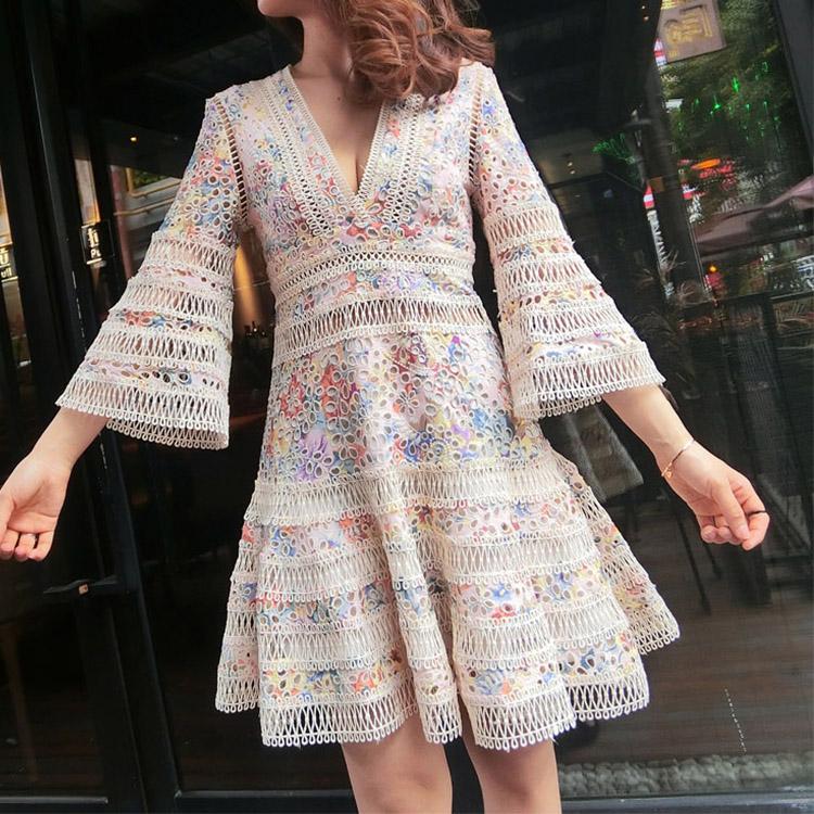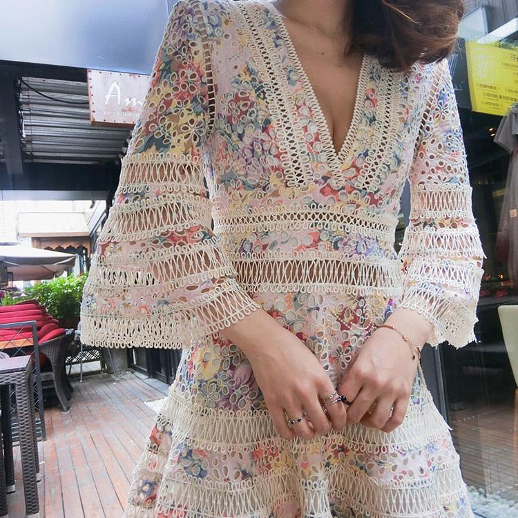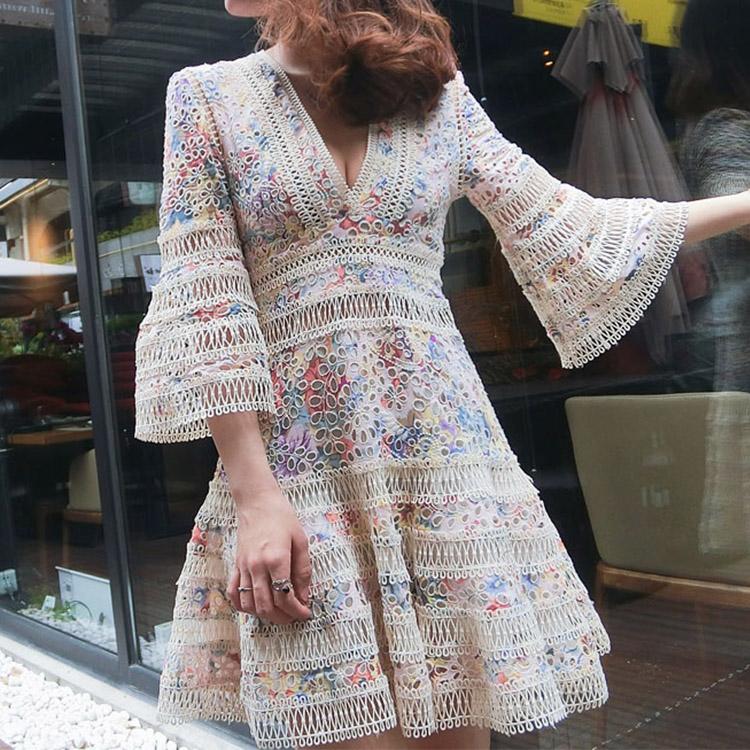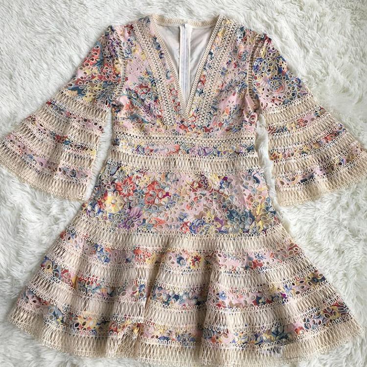#7161 RETRO FLORAL HOLLOW FLARED SLEEVE EMBROIDERY DRESS